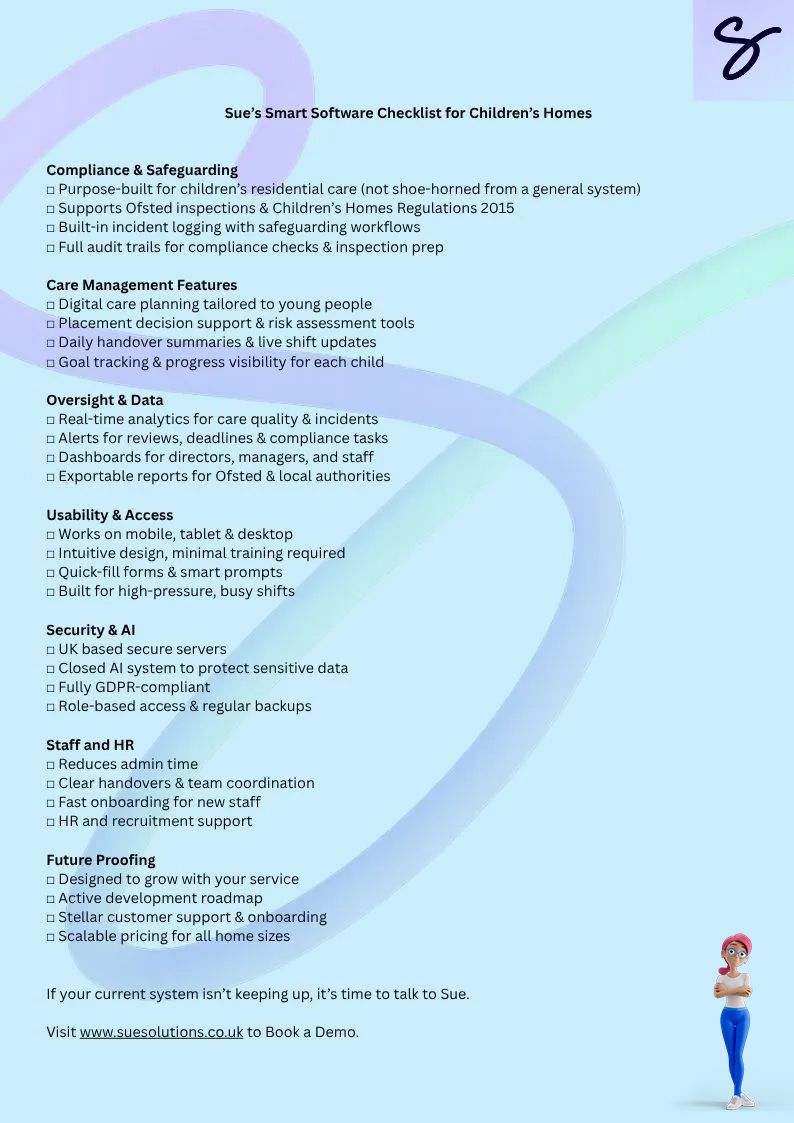 Yet so many homes are still relying on outdated systems, manual paperwork, or clunky software that wasn’t built for the specific needs of residential children’s homes. That’s where I come in. I’m Sue a digital care platform designed for people like you, by people like you.